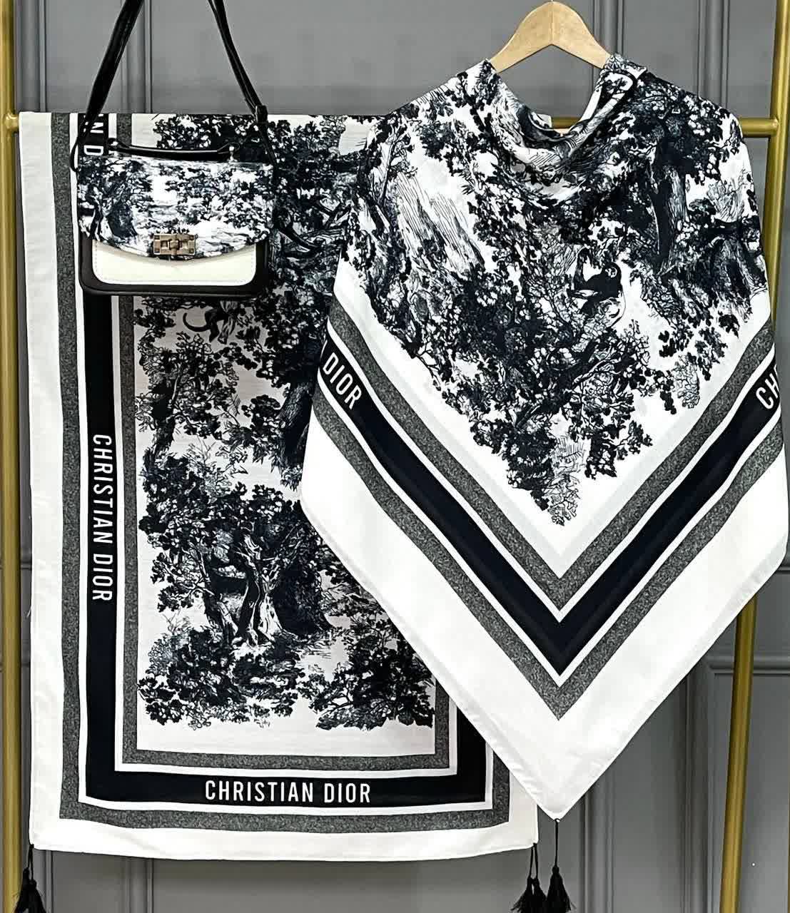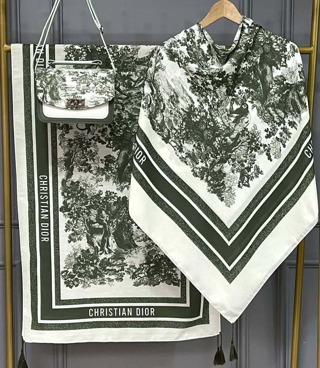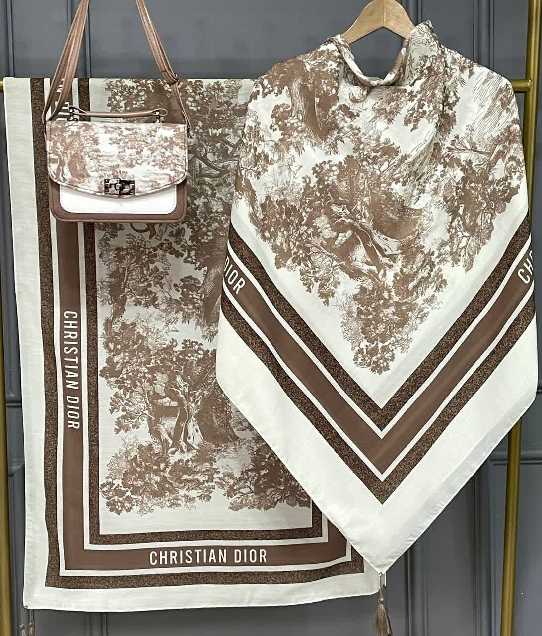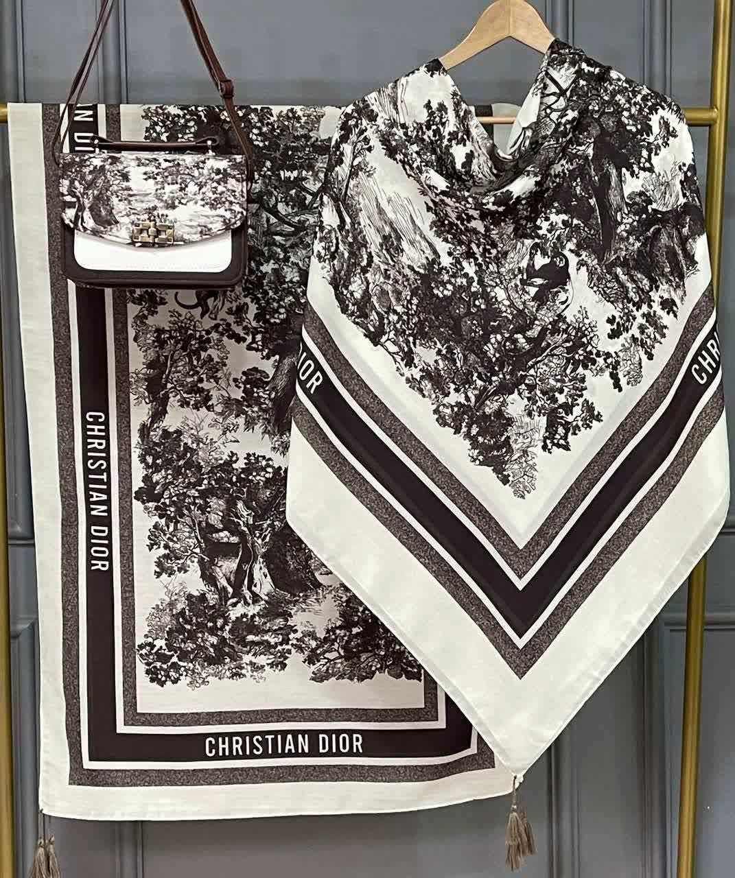 شال و روسری طرح جنگل دیور ، به همراه کیف ترکیبی از مخمل و چرم صنعتی